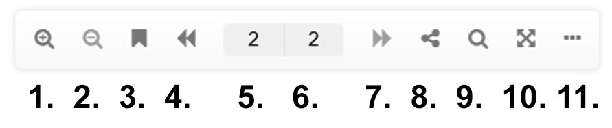 Pod dokumentem znajdują się ikonki. Od lewej kolejno: (1) powiększenie, (2) pomniejszenie, (3) zakładki, (4) przejście do poprzedniej strony (jeśli istnieje), (5) numer bieżącej strony, (6) łączna liczba stron, (7) przejście do następnej strony (jeśli istnieje), (8) udostępnianie, (9) wyszukiwanie, (10) powiększenie dokumentu na cały ekran oraz więcej opcji.